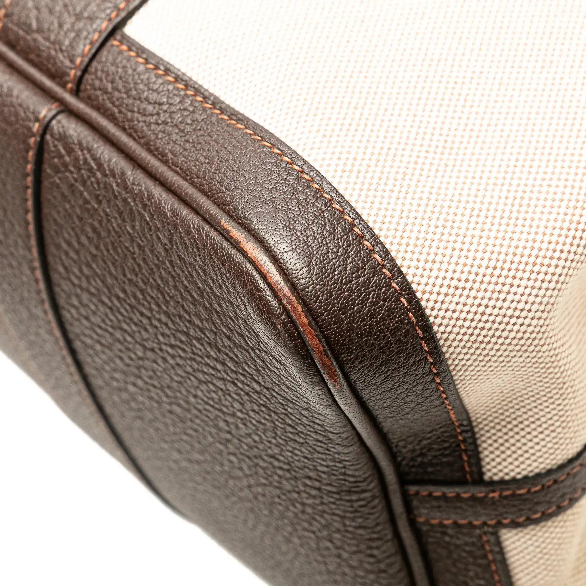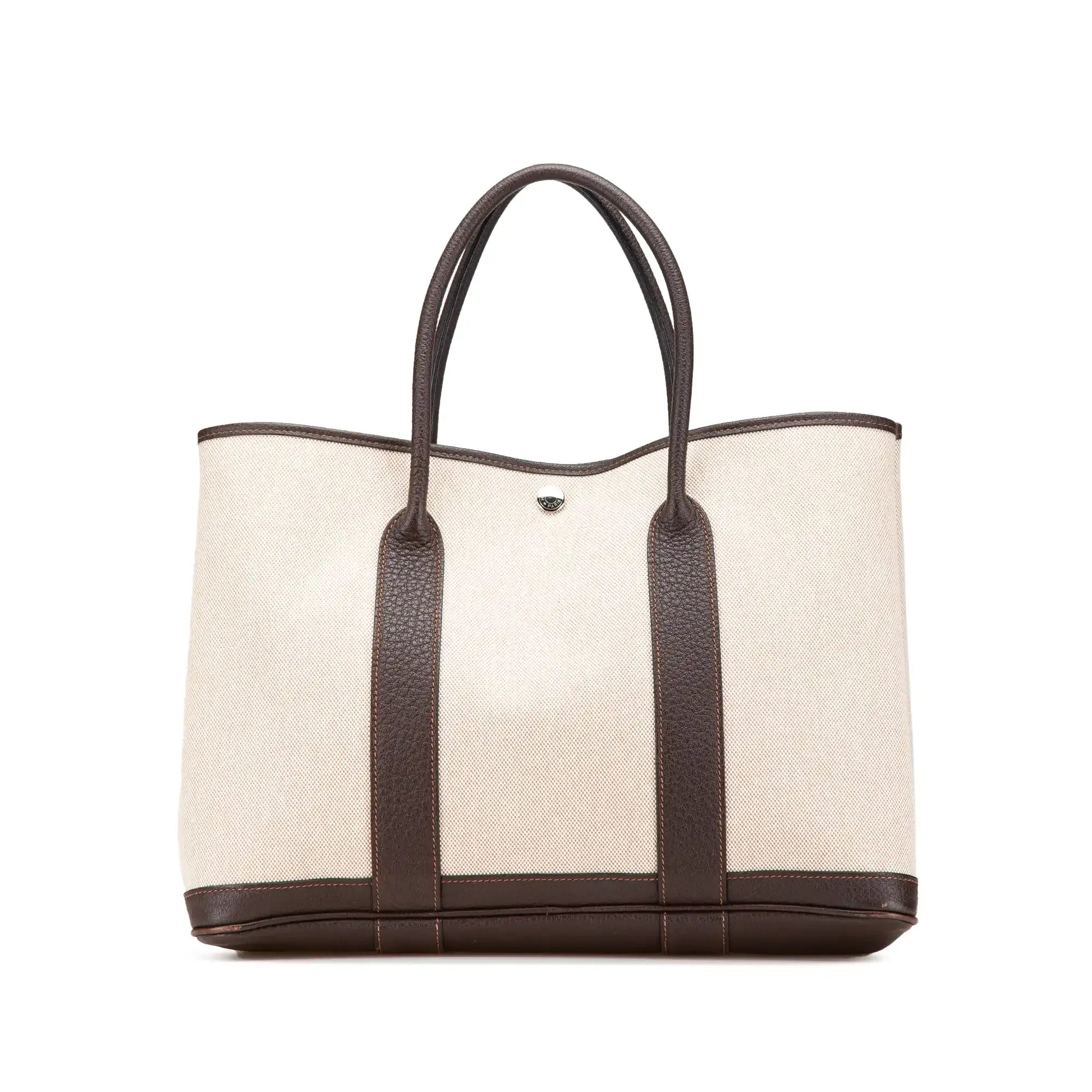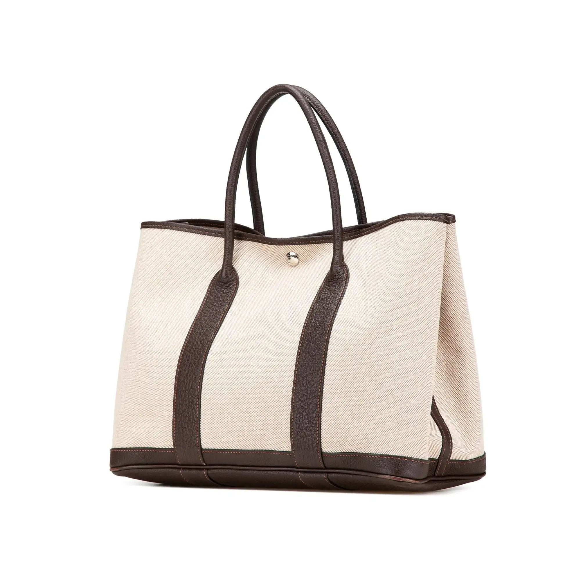 Description | The Garden Party 36 features a canvas body with Negonda leather trim, rolled leather handles, and an open top with snap button closure. | ||||||||||||