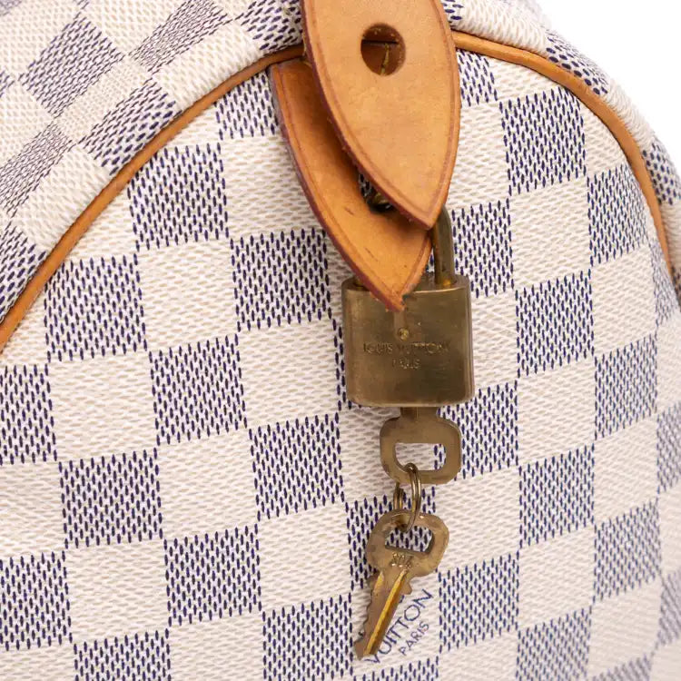 Description | The Speedy 30 features a damier canvas body with vachetta leather trim, rolled vachetta leather handles, a top zip closure, and an interior pocket. | ||||||||||||