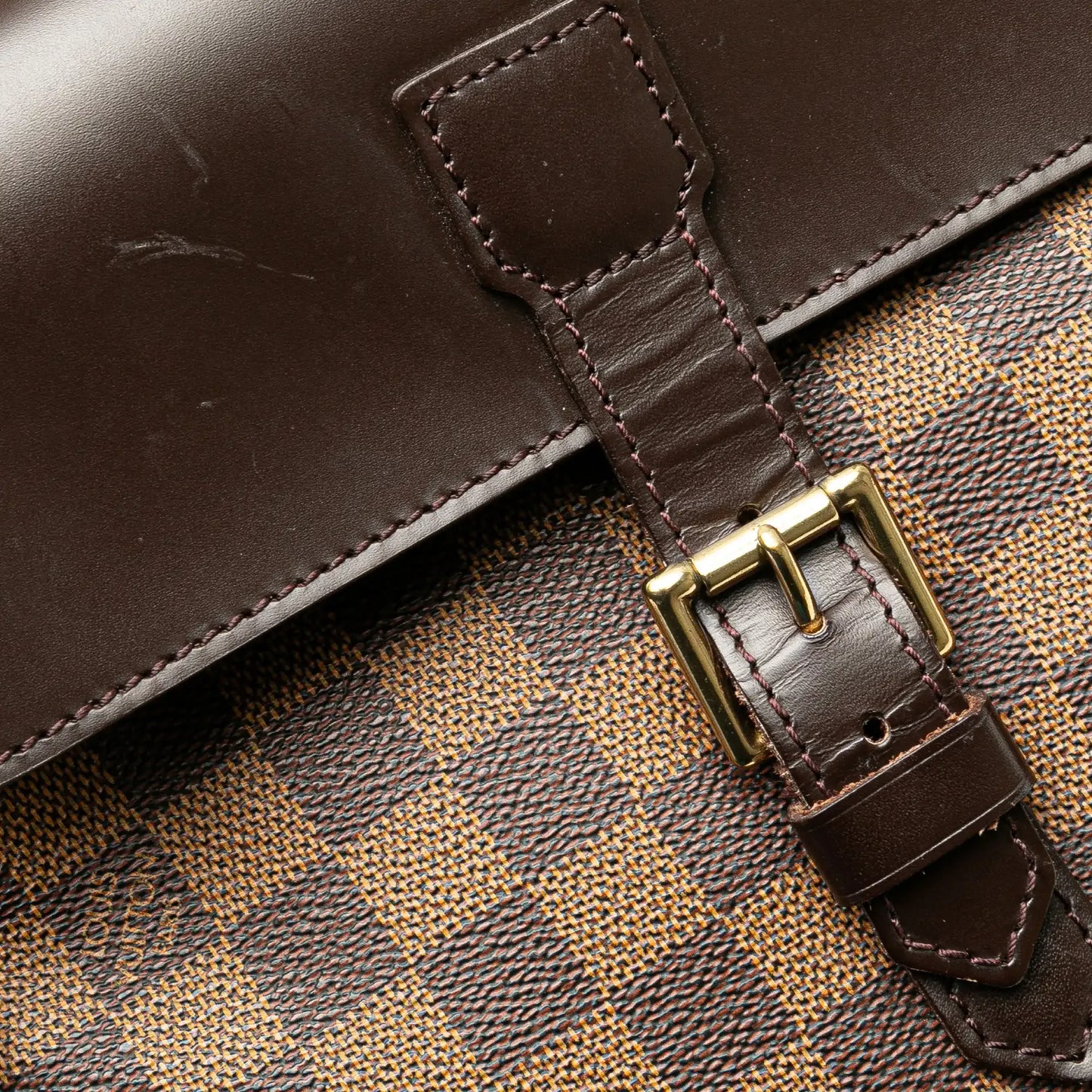 Description | The Soho Backpack features a damier ebene canvas body with leather trim, a rolled leather handle, flat leather back straps, a top flap with buckle closure, and an interior slip pocket. | ||||||||||||