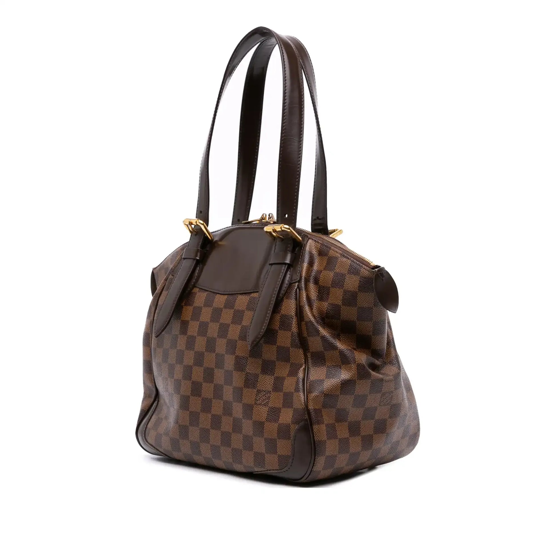 | Description | The Verona MM features a damier canvas body with leather trim, flat leather straps, a two-way top zip closure, and interior slip pockets. | ||||||||||||