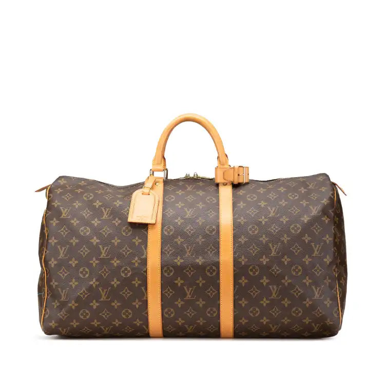 Description | The Keepall 55 features a monogram canvas body with vachetta leather trim, rolled vachetta leather handles, and a top zip closure. | ||||||||||||