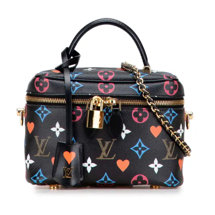 Description | This vanity bag features a monogram canvas body, a flat leather top handle, a detachable leather-woven chain strap, a top zip around closure, and interior slip pocket. | ||||||||||||