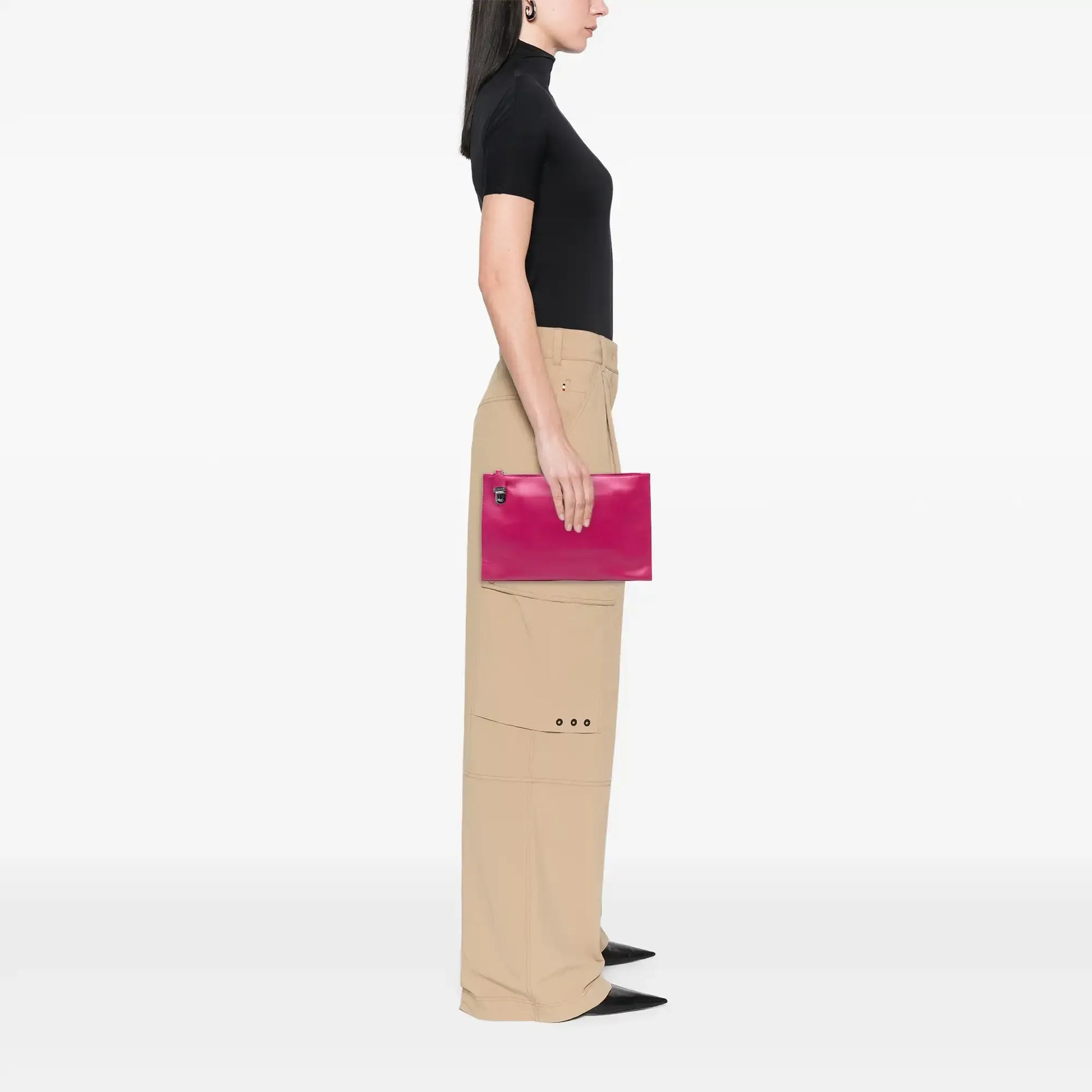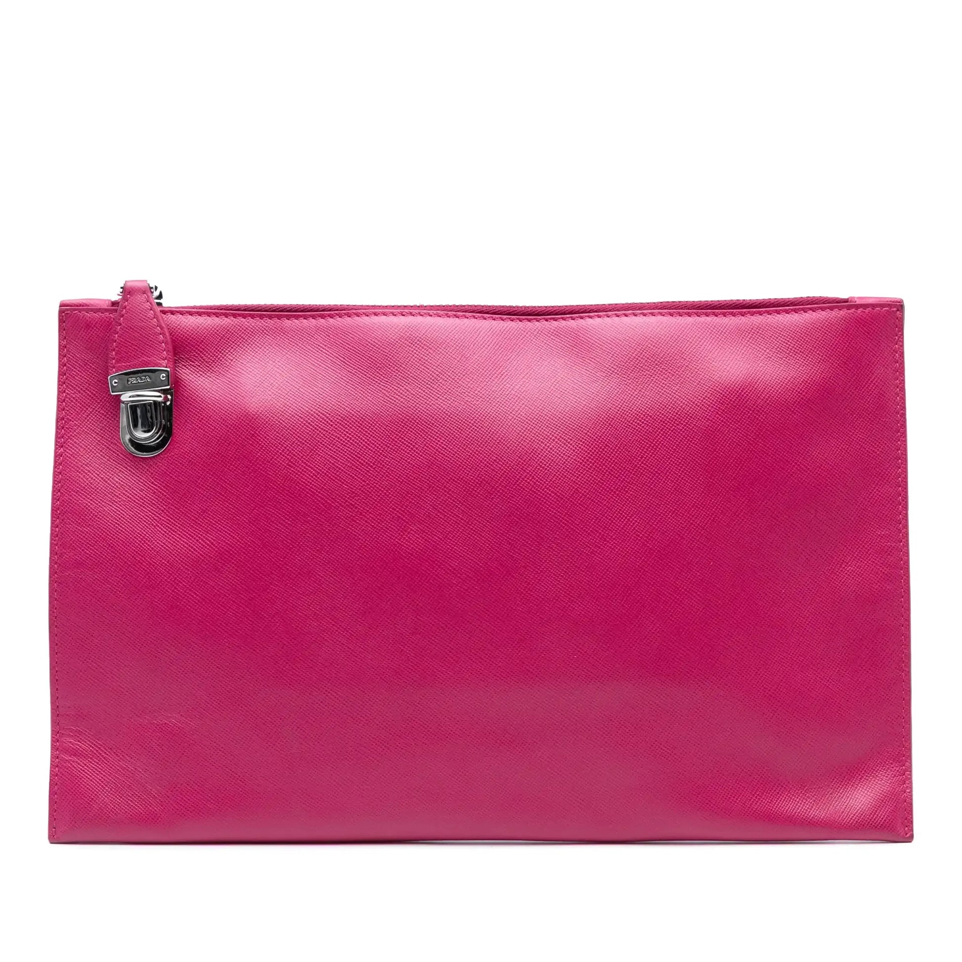 Description | This clutch bag features a saffiano leather body, top zip closure with metal lock closure, and interior zip and slip pockets. | ||||||||||||