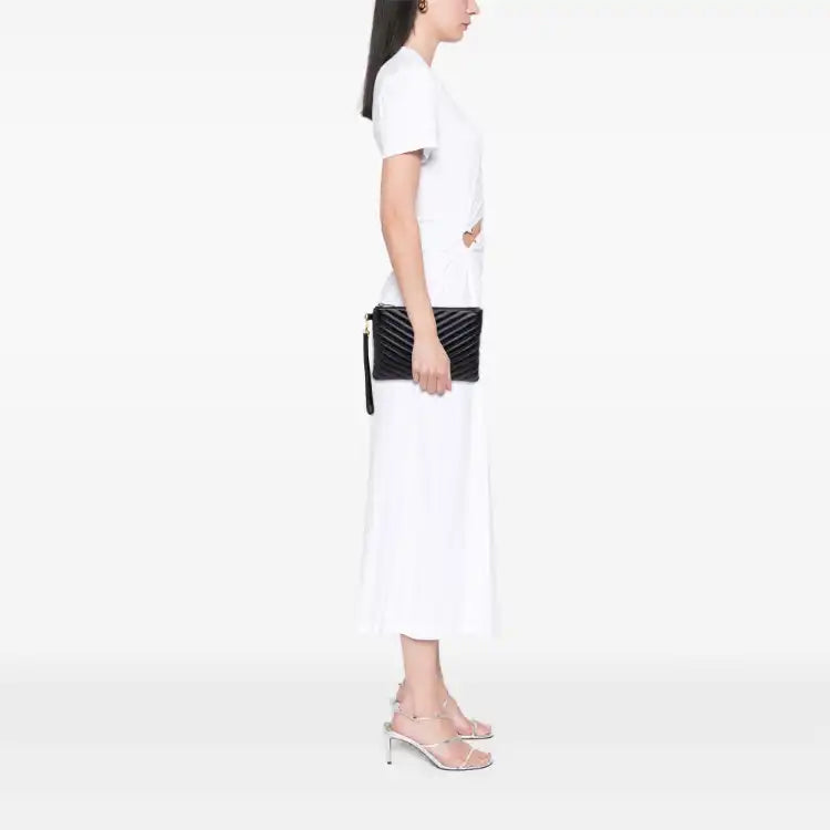 Description | This clutch bag features a quilted leather body, a detachable flat leather wrist strap, a top zip closure, and interior slip pockets. | ||||||||||||