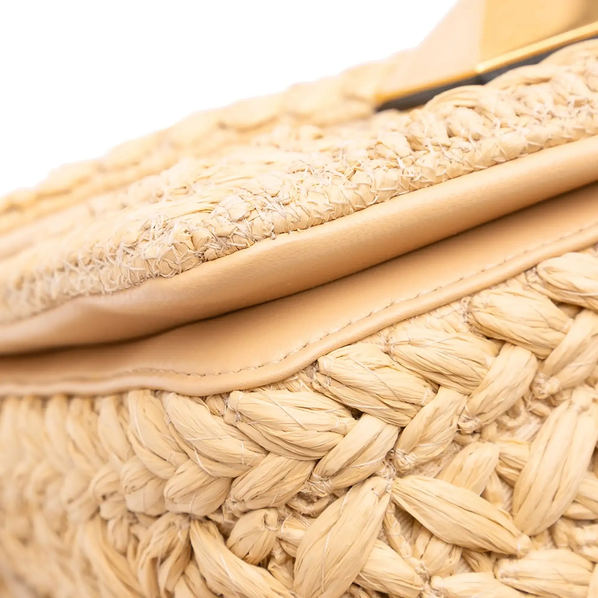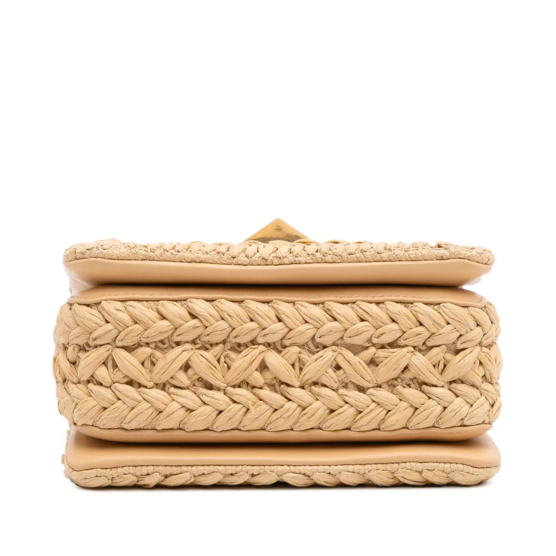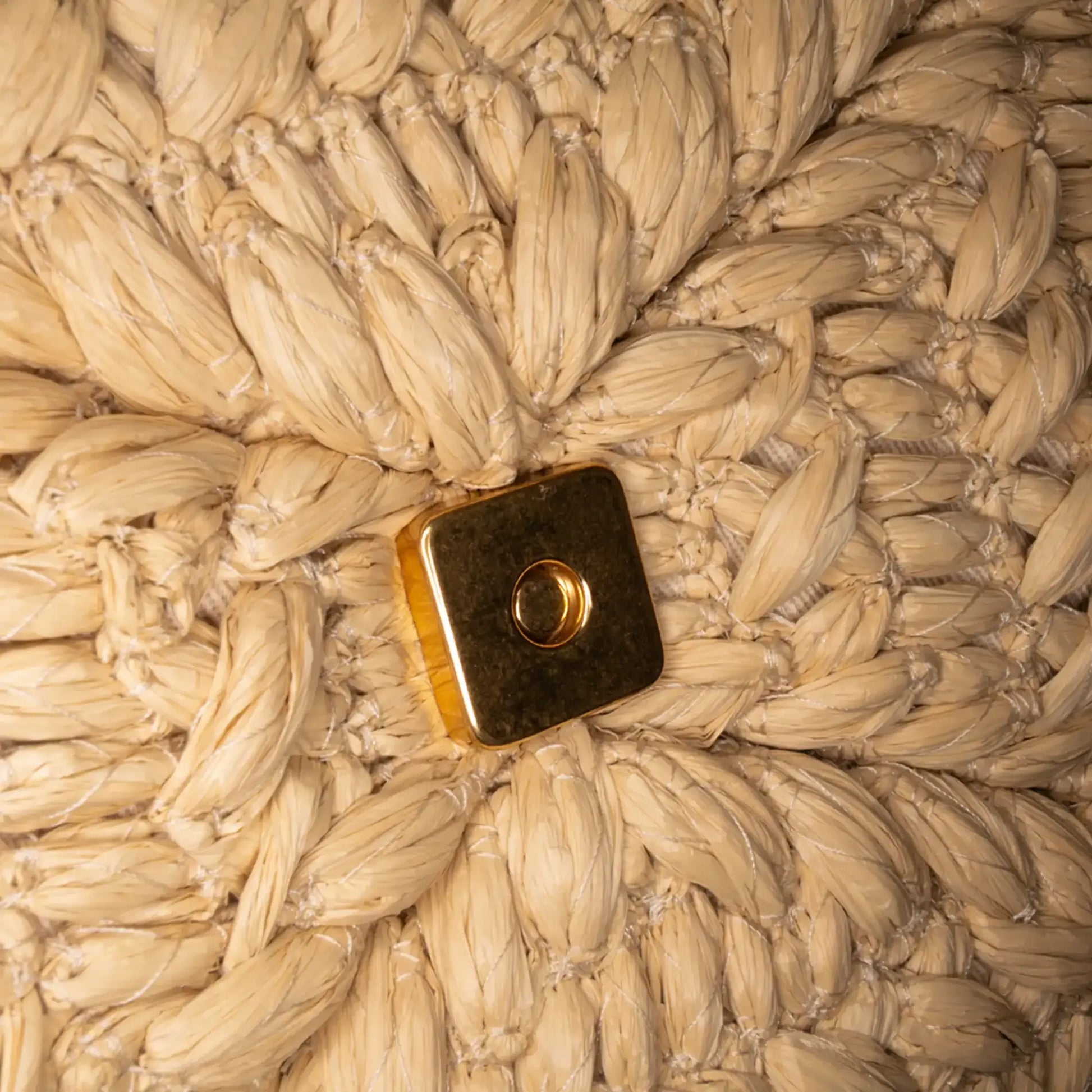 | Description | This crossbody bag features a synthetic raffia body, a gold-tone chain strap, a front flap with magnetic snap closure, and an interior slip pocket. | ||||||||||||