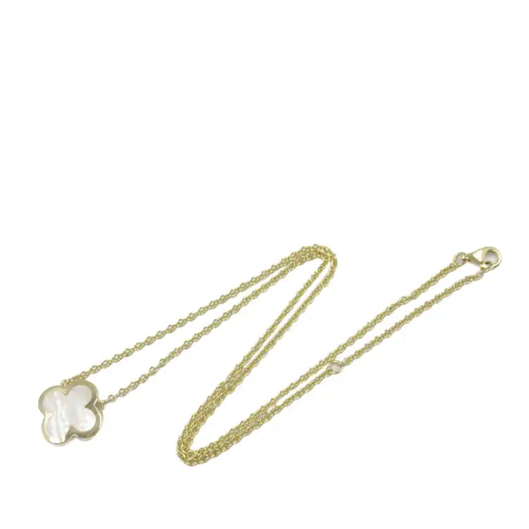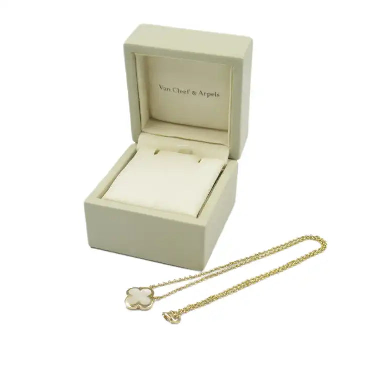 | Description | This Necklace features an 18k Yellow Gold body, a Mother of Pearl Alhambra pendant, and a lobster claw clasp closure. Measurements: Pendant: 1.6cm Width x 1.6cm Height | ||||||||||||